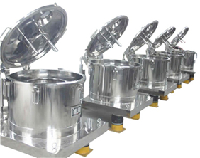 PSB系列離心機是依據GMP規范和環(huán)保要求而設計的全封閉立式上部卸料過(guò)濾離心機,電機由變頻控制(也可采用離合器)平穩啟動(dòng),通過(guò)傳動(dòng)系統帶動(dòng)轉鼓使轉鼓繞自身軸線(xiàn)高速旋轉,形成離心力場(chǎng)。加料轉速,清洗轉速,脫液轉速都可以再一定轉速(0-額定轉速)內任意選擇,在離心力場(chǎng)作用下,物料均布在轉鼓壁孔上進(jìn)行脫液分離,液相透過(guò)固相物料及濾網(wǎng)(袋)的縫隙,經(jīng)轉鼓壁孔甩至機殼空腔,從底盤(pán)出液口排出,固相物料則被截留在轉鼓內。料液由加料管加入,洗滌水通過(guò)洗滌管加入,加料,洗滌可由專(zhuān)門(mén)的閥進(jìn)行控制,物料脫水,洗滌完畢后停機,借助于特殊設計的平衡裝置,打開(kāi)機蓋,將物料卸出。